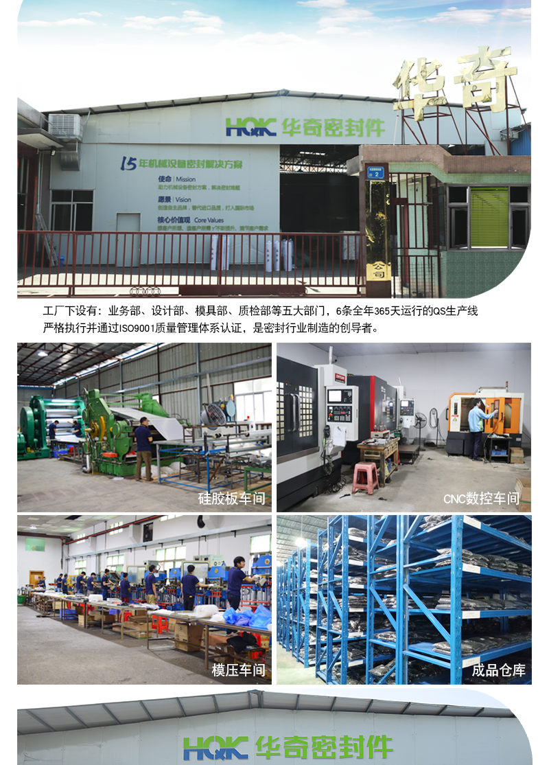 東莞市華奇密封件有限公司成立于2006年,位于廣東省東莞市石碣鎮(zhèn),占地面積10000平方米,公司員工150余人,是廣東省集橡膠硅膠硫化、橡膠擠出、硅膠擠出一體化生產(chǎn)的新型企業(yè)。 本公司主營(yíng)產(chǎn)品有:大型盾構(gòu)機(jī)密封圈,充氣密封圈,烤箱密封圈,密封條,真空吸盤(pán),密封圈O型圈,密封圈護(hù)線(xiàn)圈,金屬包膠等非標(biāo)定制硅橡膠制品。 東莞市華奇密封件有限公司材料庫(kù)擁有超過(guò)數(shù)百種獨(dú)特的配方,并擁有在嚴(yán)苛環(huán)境下,如極端溫度、介質(zhì)侵蝕、超高壓力時(shí)也具有優(yōu)良的密封材料。高性能橡膠、硅膠原材料、全自動(dòng)生產(chǎn)設(shè)備及先進(jìn)的檢驗(yàn)設(shè)備,為制造高質(zhì)量的橡膠零件提供了強(qiáng)有力的保障。公司采用先進(jìn)的管理理念,引進(jìn)精良的工藝裝備和高素質(zhì)的員工隊(duì)伍,在多年的工作過(guò)程中,把嚴(yán)格的品質(zhì)落實(shí)在生產(chǎn)流程的每一個(gè)細(xì)節(jié)中,嚴(yán)格執(zhí)行行業(yè)標(biāo)準(zhǔn),規(guī)范操作,用科學(xué)嚴(yán)謹(jǐn)?shù)墓ぷ鲬B(tài)度確保華奇每一件產(chǎn)品精準(zhǔn)可靠。產(chǎn)品暢銷(xiāo)全國(guó)近三十多個(gè)省、市自治區(qū)及遠(yuǎn)銷(xiāo)國(guó)外。竭誠(chéng)與國(guó)內(nèi)外商家雙贏(yíng)合作,共同發(fā)展,共創(chuàng)輝煌!